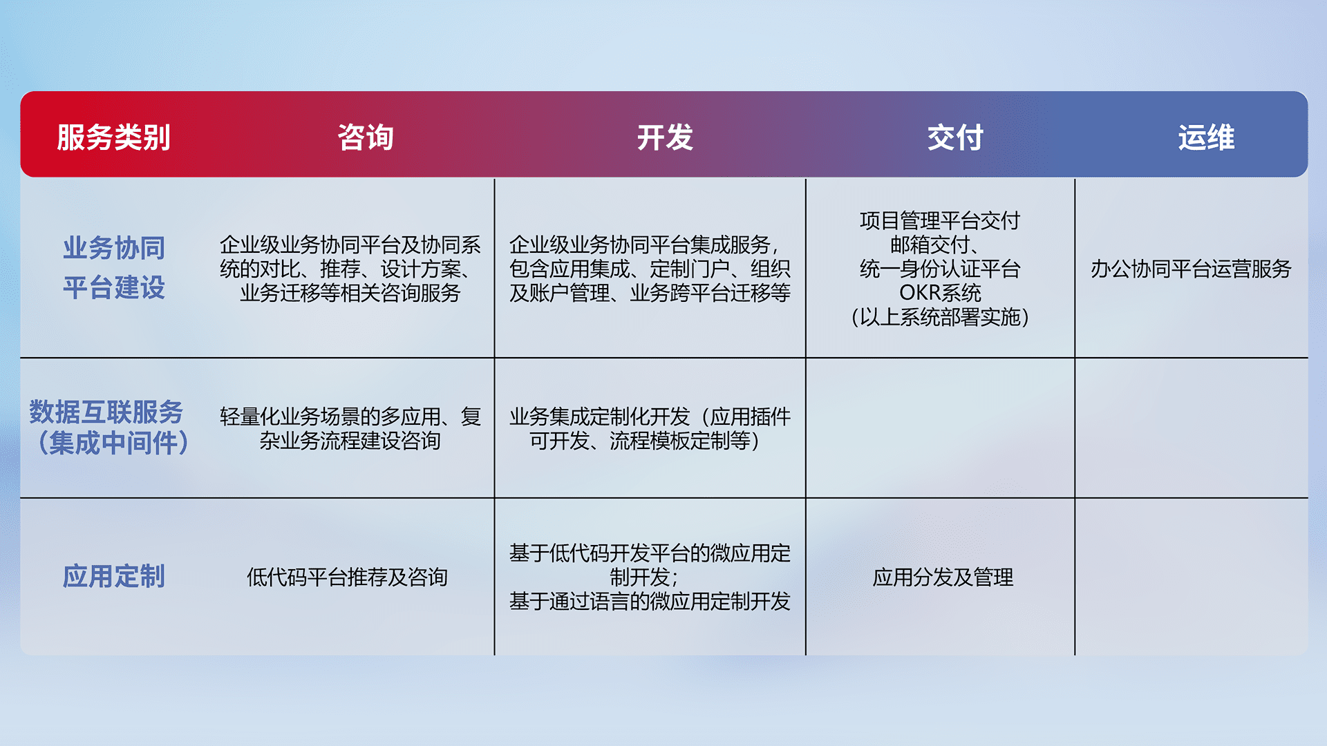 针对钉钉、、、企微、、、IDaas等平台级产品提供产品的规划、、、、方案、、、交付、、、、定制化开发等服务,,,实现如统一协同办公、、、智能客户服务、、、混合会议管理、、、、智能数据查询、、、、等业务场景,,,,实现数字化转型。。。。